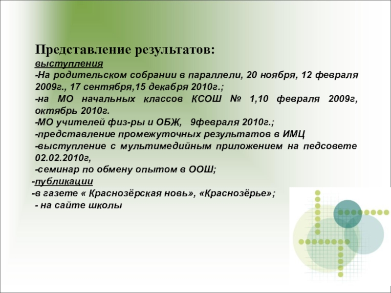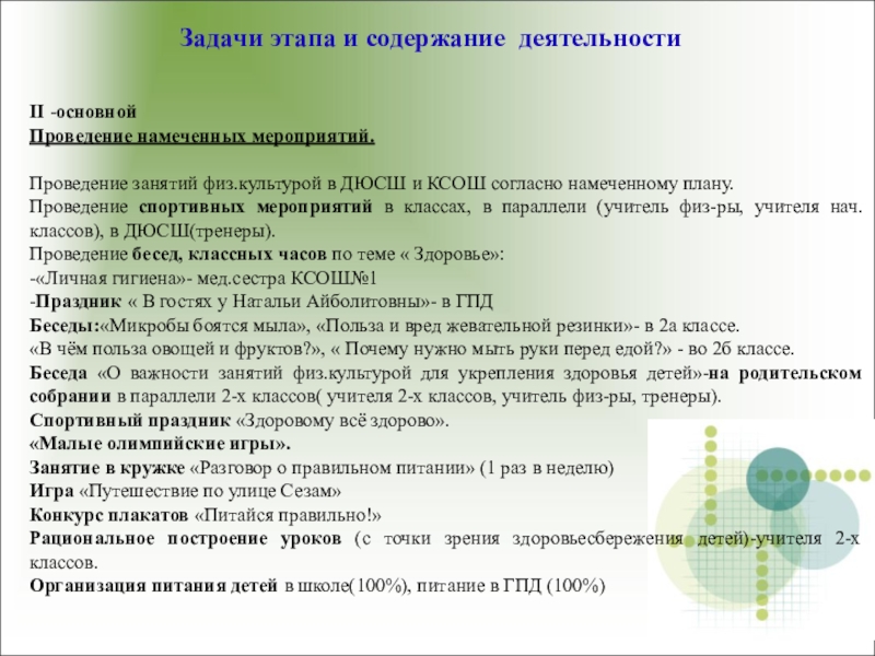 По итогам тестирования увеличилось количество уч-ся, делающих зарядку, с 33% до 60%; количество детей, сделавших правильный выбор полезных для организма продуктов выросло с 60% до90%, уровень знаний о выполнении режима дня повысился с 40% до 83%.