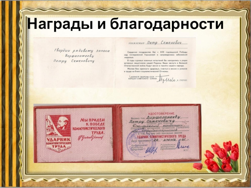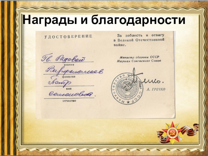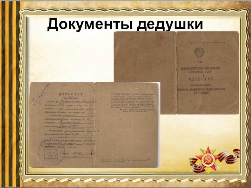 память о минувших днях. Есть такие вещи и в нашей семье: фотографии военных лет, боевые ордена и медали, а также, юбилейные награды, документы–свидетели эпохи: письма, справки, наградные листы. Я знаю о войне только по рассказам родных, фильмам и книгам, но хорошо понимаю, что война – это всегда боль, разрушение, невосполнимые потери близких людей, да и для тех, кто прошел войну, она не проходит бесследно. Яркое тому свидетельство – судьбы людские, в том числе и моих родных: моих прадедушек и прабабушек, дедушек и бабушек, их братьев и сестер. Я горжусь своим дедушкой.