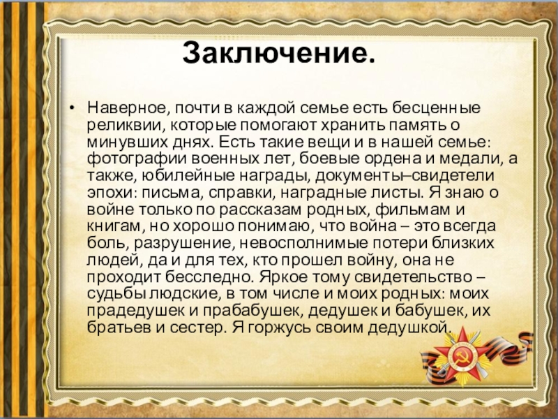 Заключение. Наверное, почти в каждой семье есть бесценные реликвии, которые помогают хранить память о минувших днях.