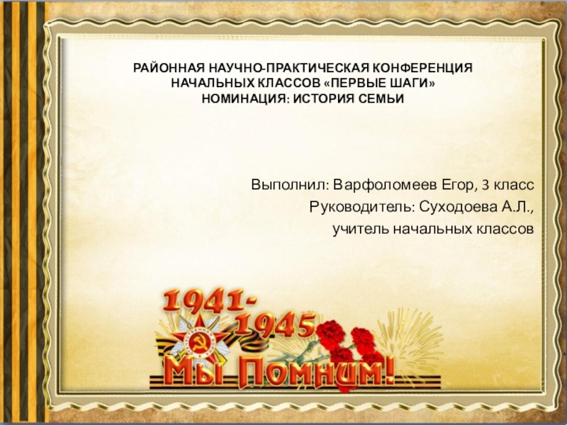 Районная научно-практическая конференция начальных классов «Первые шаги» Номинация: история семьи  Выполнил: Варфоломеев Егор, 3 классРуководитель: Суходоева