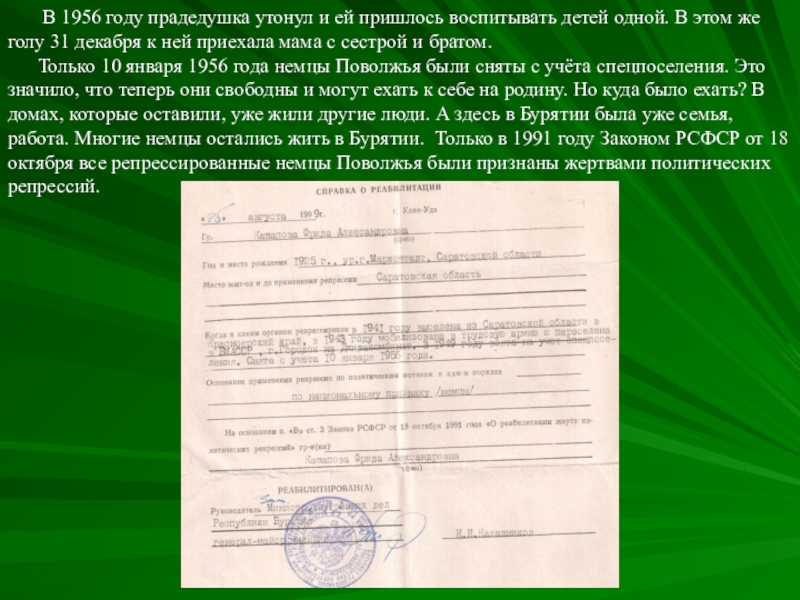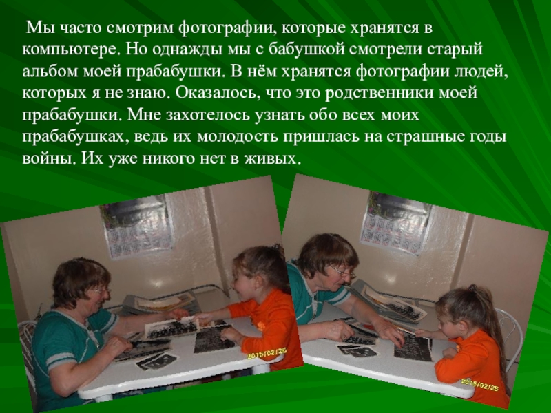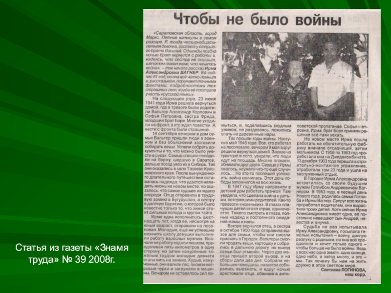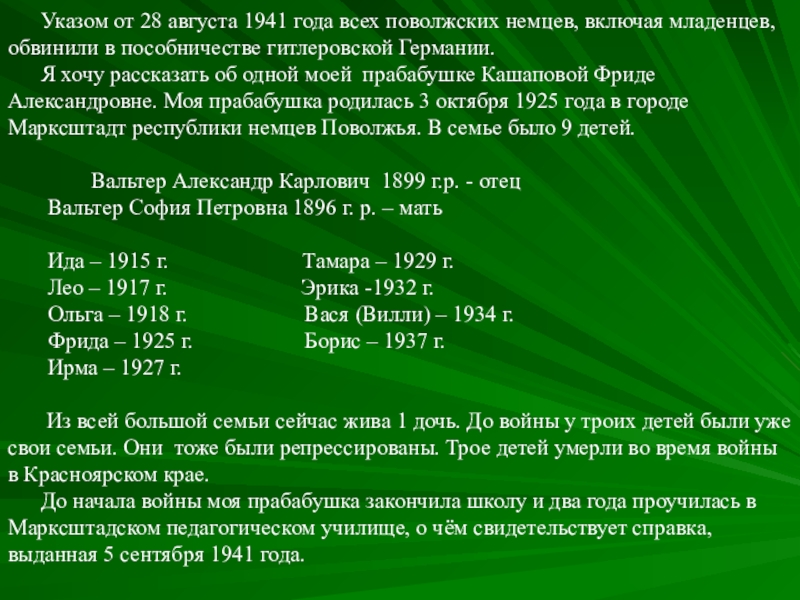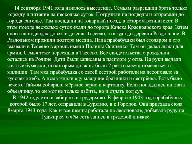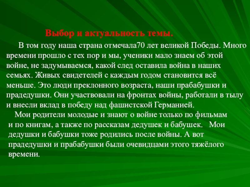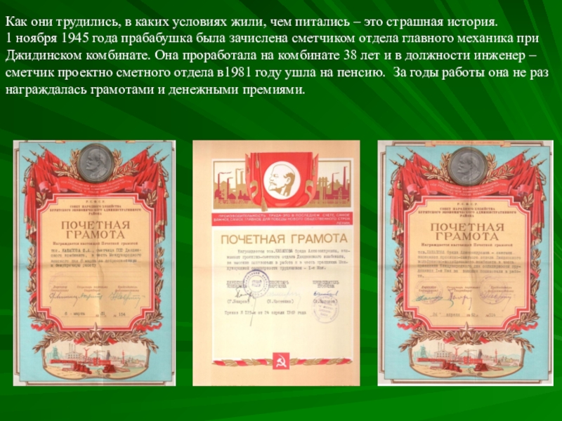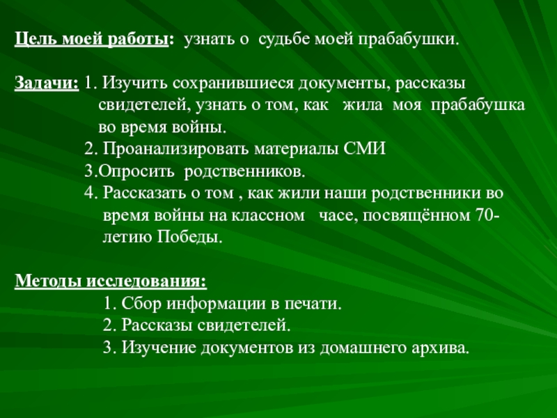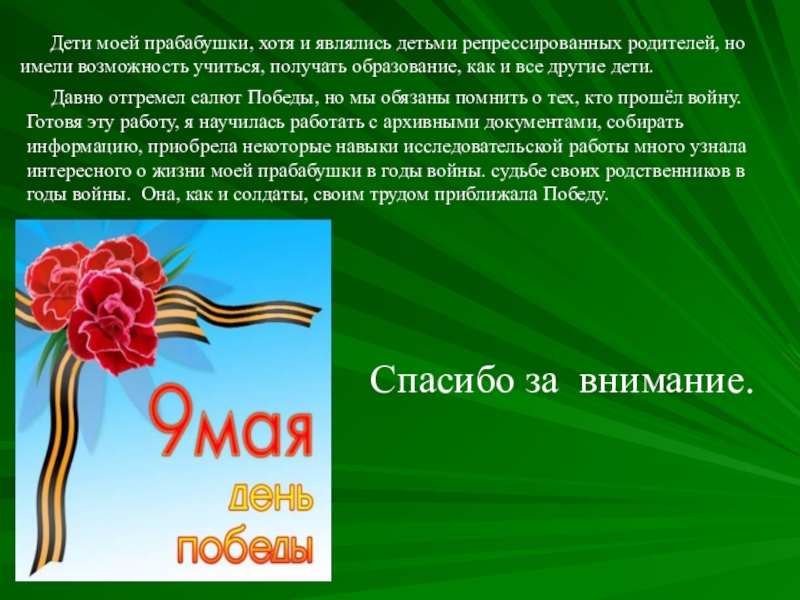 Давно отгремел салют Победы, но мы обязаны помнить о тех, кто прошёл войну. Готовя эту работу, я научилась работать с архивными документами, собирать информацию, приобрела некоторые навыки исследовательской работы много узнала интересного о жизни моей прабабушки в годы войны. судьбе своих родственников в годы войны. Она, как и солдаты, своим трудом приближала Победу.