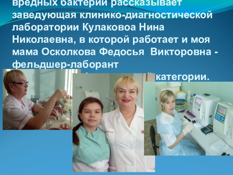 лаборатории Кулаковоа Нина Николаевна, в которой работает и моя мама Осколкова Федосья Викторовна - фельдшер-лаборант