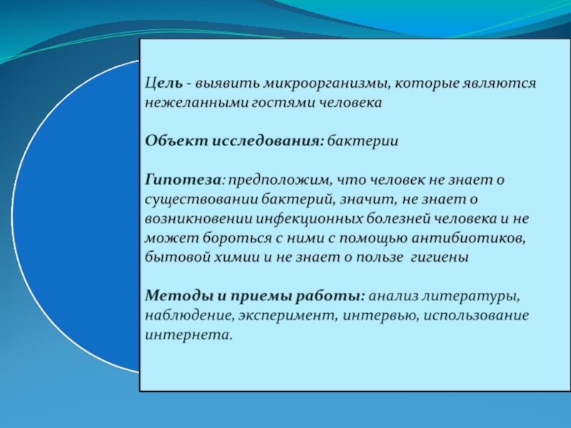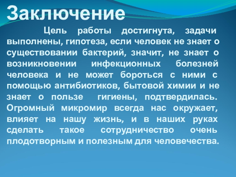 не знает о существовании бактерий, значит, не знает о возникновении инфекционных болезней человека и не может бороться с ними с помощью антибиотиков, бытовой химии и не знает о пользе гигиены, подтвердилась. Огромный микромир всегда нас окружает, влияет на нашу жизнь, и в наших руках сделать такое сотрудничество очень плодотворным и полезным для человечества.