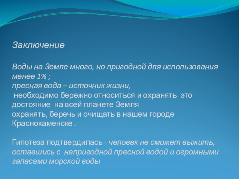 вода – источник жизни, необходимо бережно относиться и охранять это достояние на всей планете Земля охранять, беречь и очищать в нашем городе Краснокаменске . Гипотеза подтвердилась - человек не сможет выжить, оставшись с непригодной пресной водой и огромными запасами морской воды