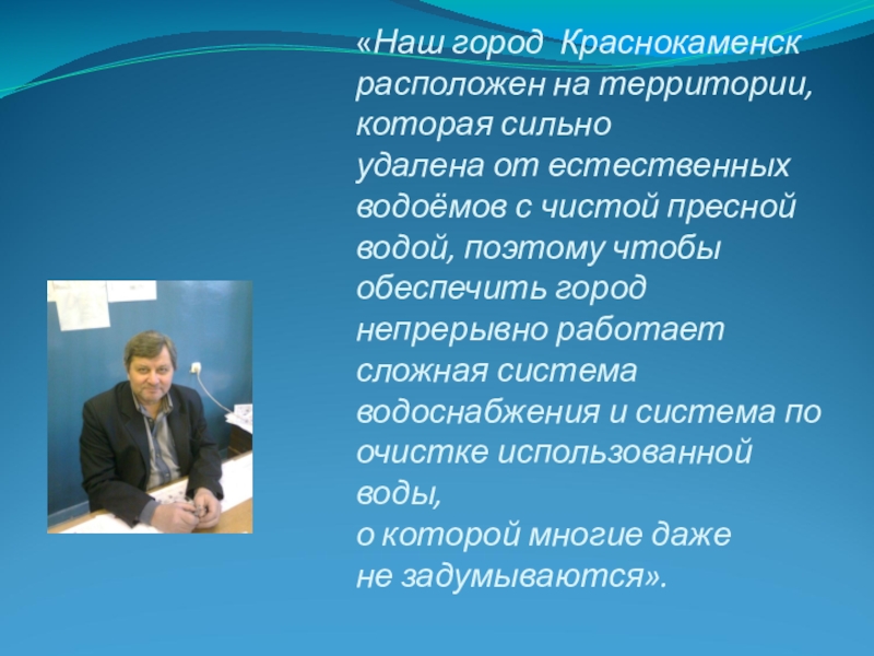 Слайд 10«Наш город Краснокаменск расположен на территории, которая сильно удалена от естественных водоёмов