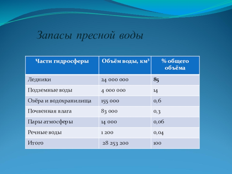 Слайд 5 Запасы пресной воды