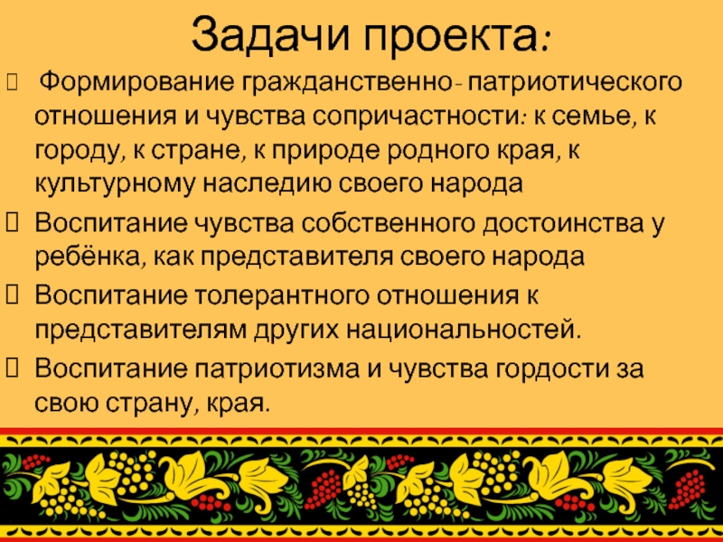 Задачи проекта: Формирование гражданственно- патриотического отношения и чувства сопричастности: к семье, к городу, к стране, к природе