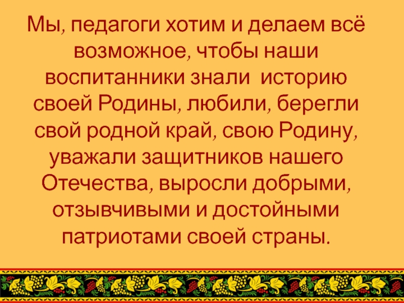 Мы, педагоги хотим и делаем всё возможное, чтобы наши воспитанники знали историю своей Родины, любили, берегли свой
