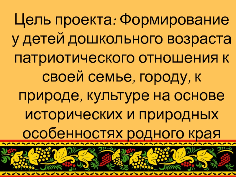 Цель проекта: Формирование у детей дошкольного возраста патриотического отношения к своей семье, городу, к природе, культуре на