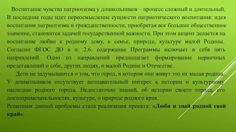 Дети не задумываются о том, что город, в котором они живут это их малая родина. У дошкольников отсутствует познавательный интерес к истории и культурному наследию родного города. Недостаточно знаний, об истории своего города, его достопримечательностях, культуре, о природе родного края. Решением данной проблемы стала реализация проекта: «Люби и знай родной свой край».