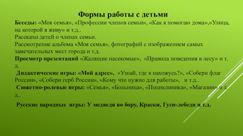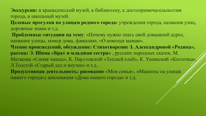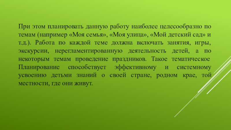 семья», «Моя улица», «Мой детский сад» и т.д.). Работа по каждой теме должна включать занятия, игры, экскурсии, нерегламентированную деятельность детей, а по некоторым темам проведение праздников. Такое тематическое Планирование способствует эффективному и системному усвоению детьми знаний о своей стране, родном крае, той местности, где они живут.
