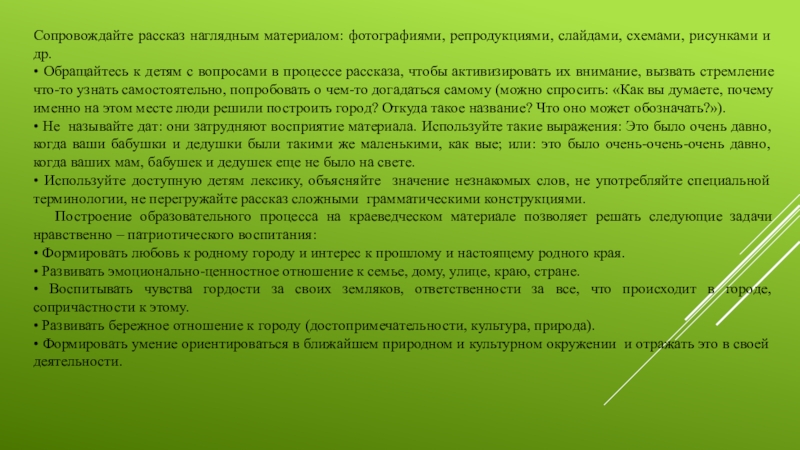 Обращайтесь к детям с вопросами в процессе рассказа, чтобы активизировать их внимание, вызвать стремление что-то узнать самостоятельно, попробовать о чем-то догадаться самому (можно спросить: «Как вы думаете, почему именно на этом месте люди решили построить город? Откуда такое название? Что оно может обозначать?»).