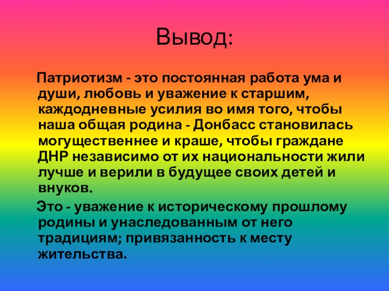 и уважение к старшим, каждодневные усилия во имя того, чтобы наша общая родина - Донбасс становилась могущественнее и краше, чтобы граждане ДНР независимо от их национальности жили лучше и верили в будущее своих детей и внуков.
