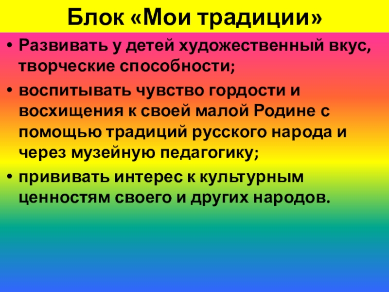 и восхищения к своей малой Родине с помощью традиций русского народа и через музейную педагогику;