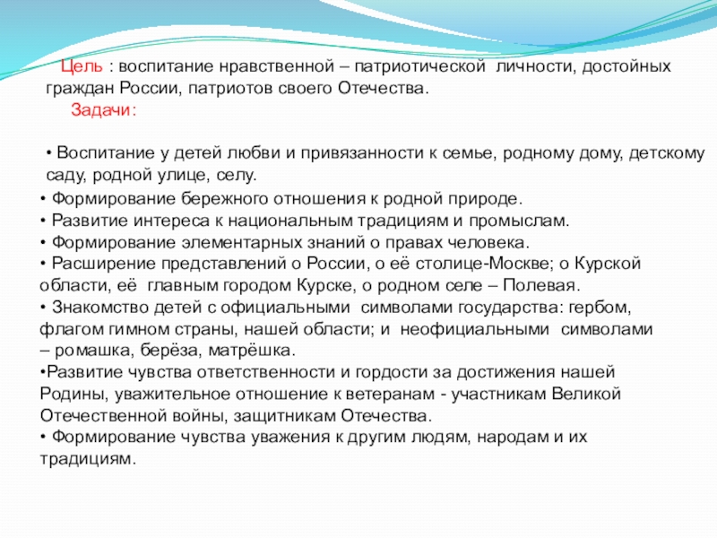 Цель : воспитание нравственной – патриотической личности, достойных граждан России, патриотов своего Отечества.