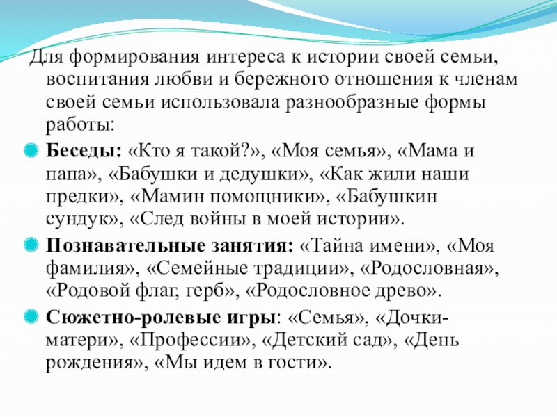 отношения к членам своей семьи использовала разнообразные формы работы: