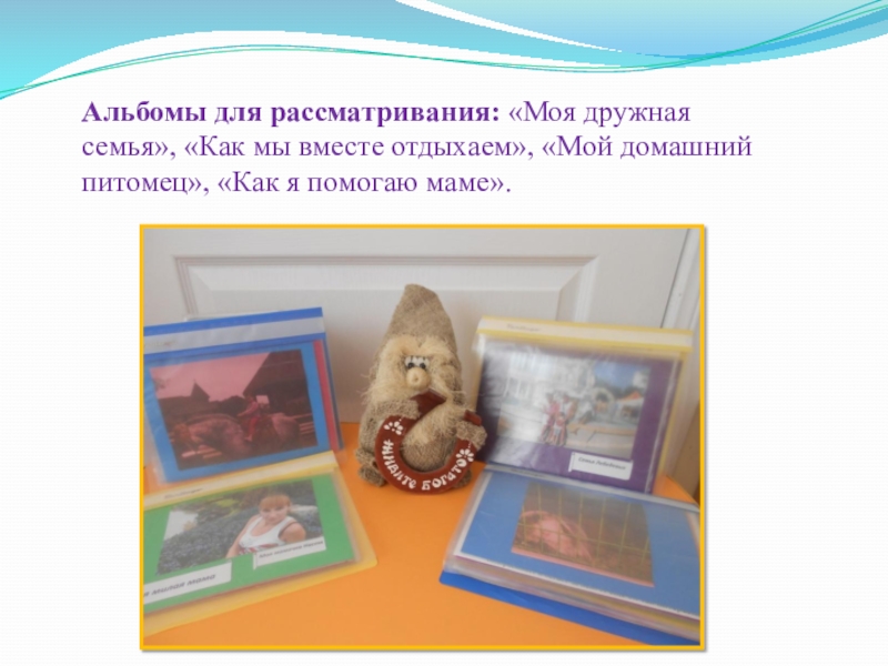 Слайд 13Альбомы для рассматривания: «Моя дружная семья», «Как мы вместе отдыхаем», «Мой