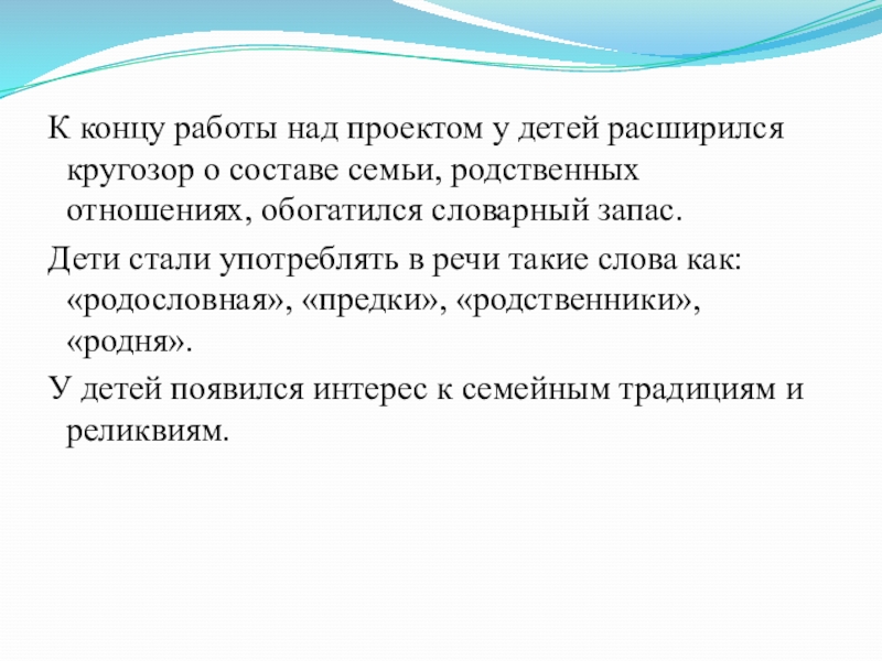 Дети стали употреблять в речи такие слова как: «родословная», «предки», «родственники», «родня».