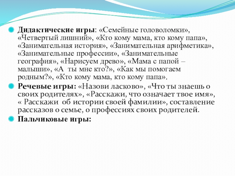 Слайд 16Дидактические игры: «Семейные головоломки», «Четвертый лишний», «Кто кому мама, кто кому