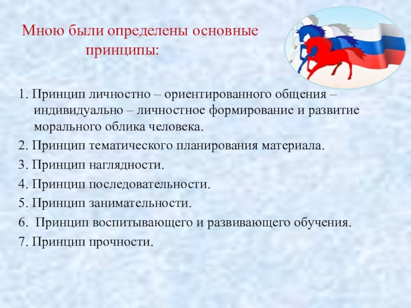 1. Принцип личностно – ориентированного общения – индивидуально – личностное формирование и развитие морального облика человека.