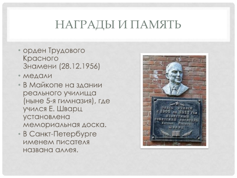 (ныне 5-я гимназия), где учился Е. Шварц установлена мемориальная доска.