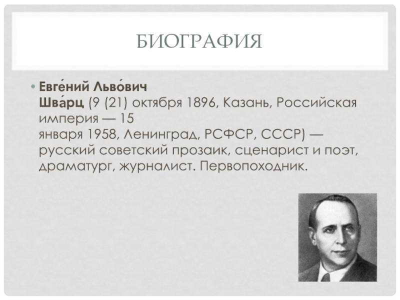 БиографияЕвге́ний Льво́вич Шва́рц (9 (21) октября 1896, Казань, Российская империя — 15 января 1958, Ленинград, РСФСР, СССР) — русский советский прозаик, сценарист и поэт, драматург, журналист. Первопоходник.