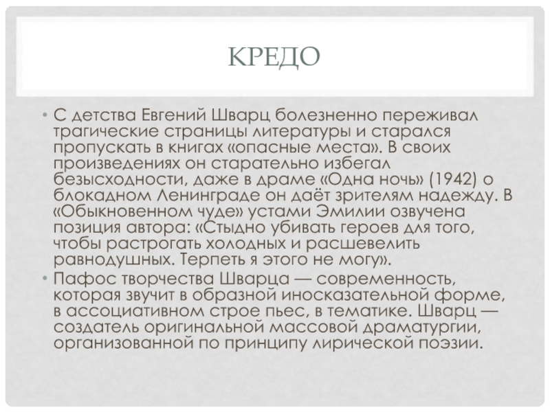 пропускать в книгах «опасные места». В своих произведениях он старательно избегал безысходности, даже в драме «Одна ночь» (1942) о блокадном Ленинграде он даёт зрителям надежду. В «Обыкно­венном чуде» устами Эмилии озвучена позиция автора: «Стыдно убивать героев для того, чтобы растрогать холодных и расшевелить равнодушных. Терпеть я этого не могу».