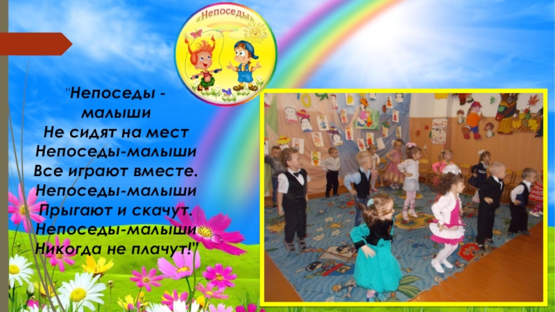 Слайд 4 "Непоседы - малыши  Не сидят на мест  Непоседы-малыши  Все играют вместе.  Непоседы-малыши  Прыгают и скачут.  Непоседы-малыши  Никогда не