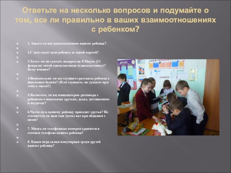 4.Внимательно ли вы слушаете рассказы ребенка о школьных буднях? (Или слушаете, но думаете при этом о своем?)