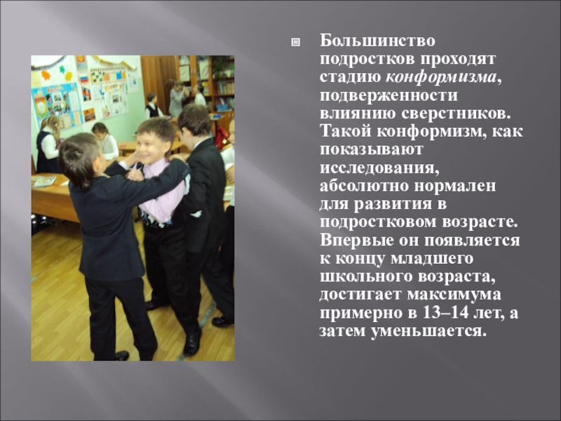 Большинство подростков проходят стадию конформизма, подверженности влиянию сверстников. Такой конформизм, как