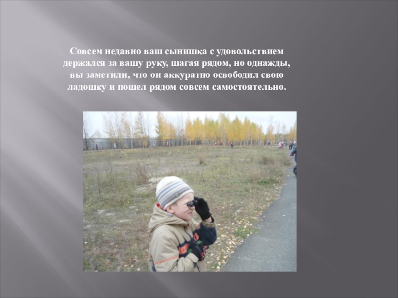 Слайд 5Совсем недавно ваш сынишка с удовольствием держался за вашу руку, шагая