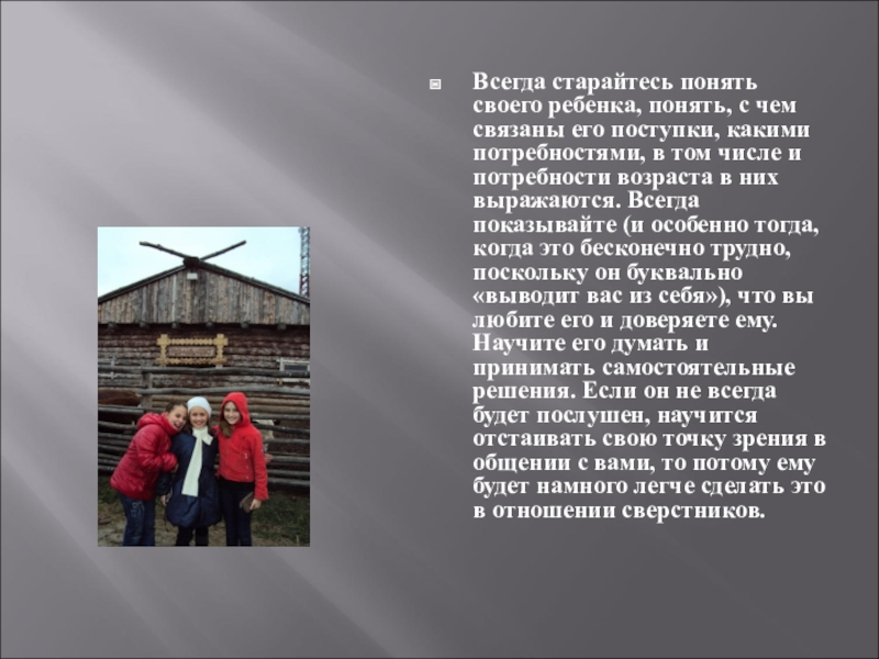 какими потребностями, в том числе и потребности возраста в них выражаются. Всегда показывайте (и особенно тогда, когда это бесконечно трудно, поскольку он буквально «выводит вас из себя»), что вы любите его и доверяете ему. Научите его думать и принимать самостоятельные решения. Если он не всегда будет послушен, научится отстаивать свою точку зрения в общении с вами, то потому ему будет намного легче сделать это в отношении сверстников.