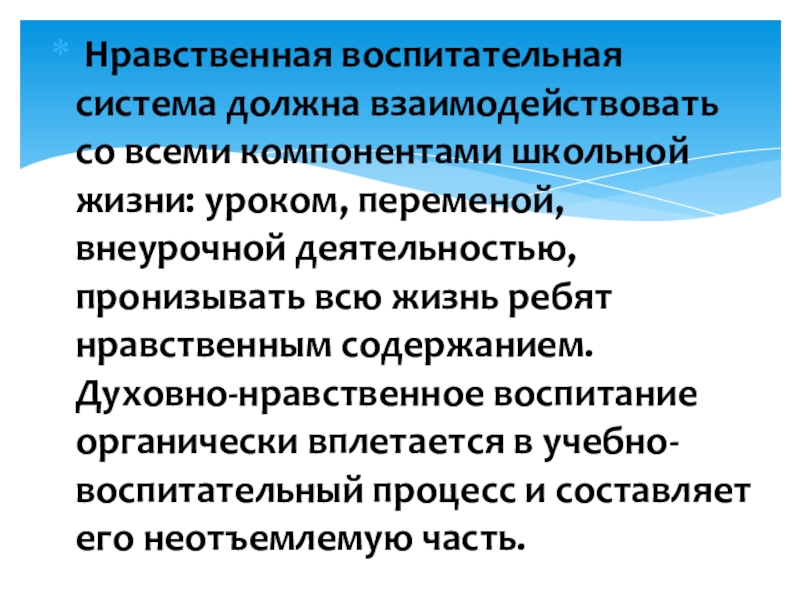 Нравственная воспитательная система должна взаимодействовать со всеми компонентами школьной жизни: уроком, переменой, внеурочной деятельностью, пронизывать всю