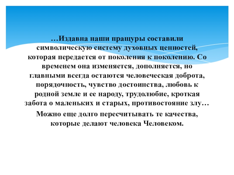 …Издавна наши пращуры составили символическую систему духовных ценностей, которая передается от поколения к поколению. Со временем она