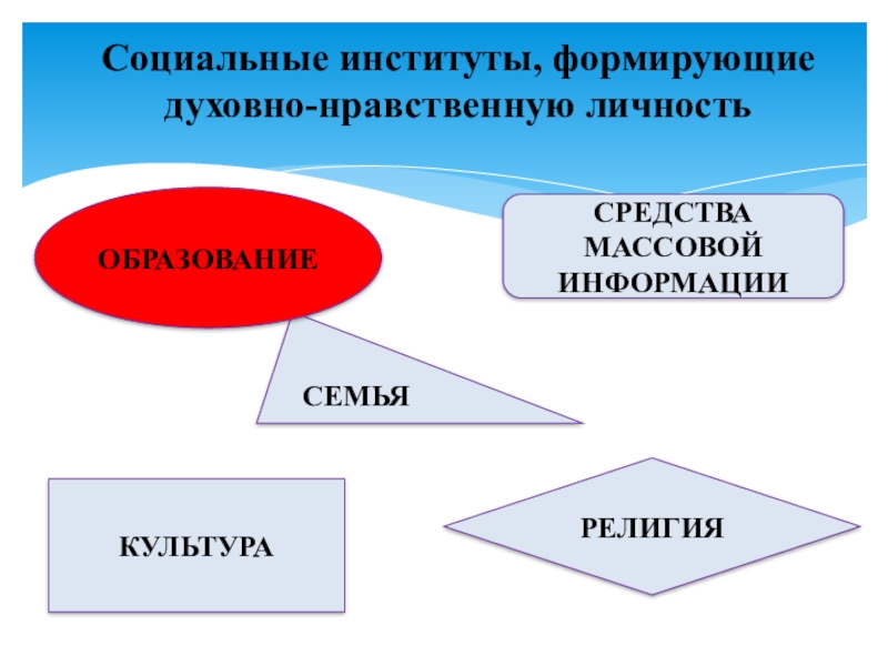 Социальные институты, формирующие духовно-нравственную личностьСЕМЬЯОБРАЗОВАНИЕКУЛЬТУРАСРЕДСТВА МАССОВОЙ ИНФОРМАЦИИРЕЛИГИЯ