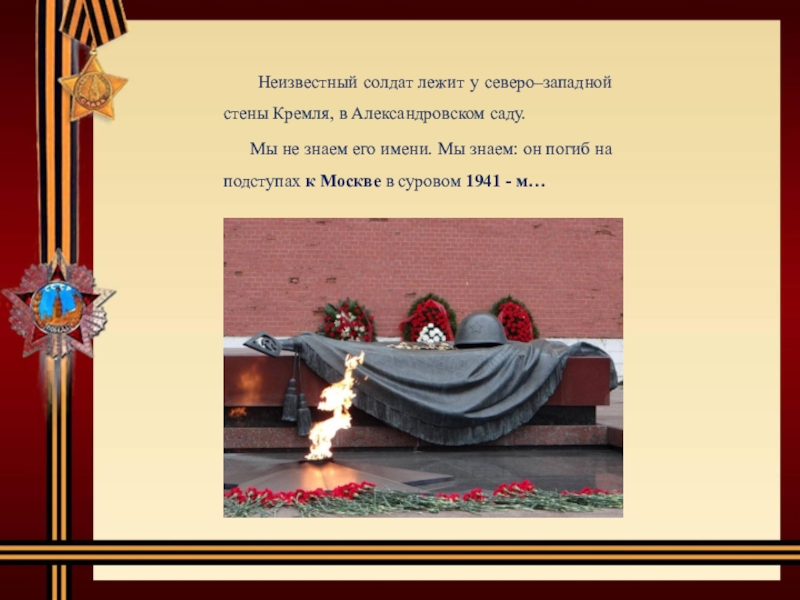 Мы не знаем его имени. Мы знаем: он погиб на подступах к Москве в суровом 1941 - м…