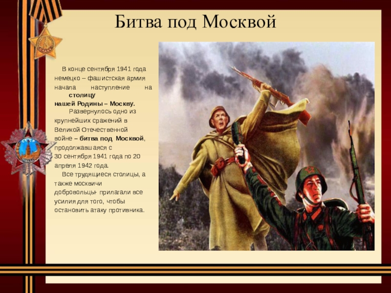 1.Раскрыть, как Москва держала оборону против фашистов. Битва под Москвой – одна из самых крупных битв.