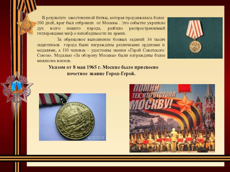 Указом от 8 мая 1965 г. Москве было присвоено почетное звание Город-Герой.
