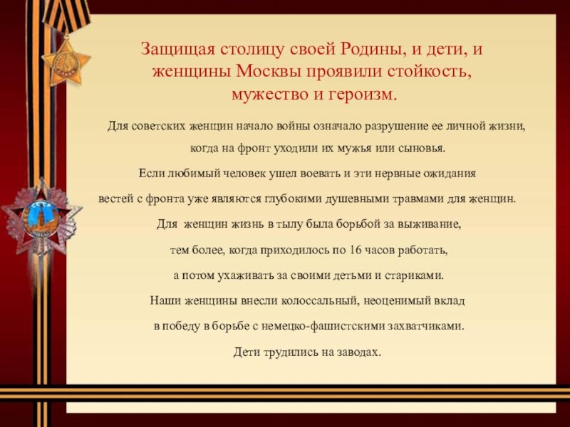Слайд 11Защищая столицу своей Родины, и дети, и женщины Москвы проявили стойкость,