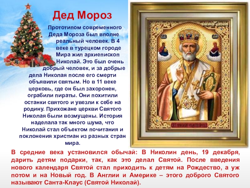 В средние века установился обычай: В Николин день, 19 декабря, дарить детям подарки, так, как это делал Святой. После введения нового календаря Святой стал приходить к детям на Рождество, а уж потом и на Новый год. В Англии и Америке – этого доброго Святого называют Санта-Клаус (Святой Николай).