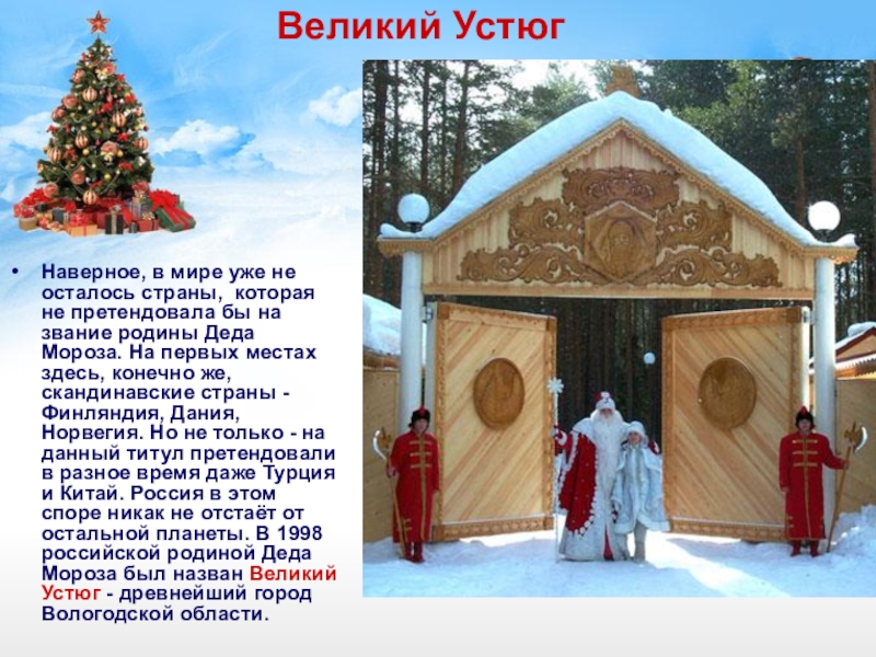 Только у нашего Деда Мороза есть внучка Снегурочка и родилась она в России. Снегурочка - это литературный персонаж. Появилась она в 1873 году и сначала называлась не внучкой деда Мороза, а дочкой . Произошло это благодаря пьесе Александра Островского «Снегурочка», которую он создал на основе народной сказки о девушке, вылепленной из снега и растаявшей от теплых солнечных лучей. Позже писатели и поэты превратили ее во внучку.