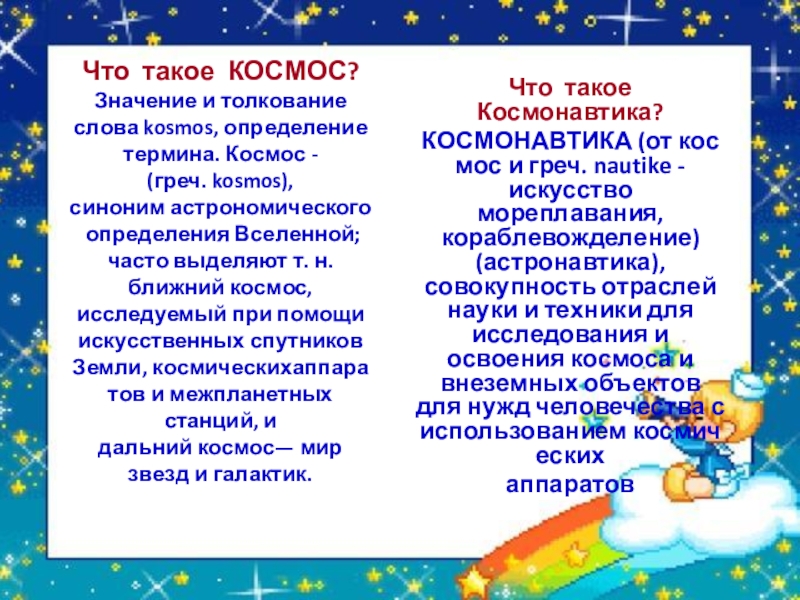КОСМОНАВТИКА (от космос и греч. nautike - искусство мореплавания, кораблевожделение) (астронавтика), совокупность отраслей науки и техники для исследования и освоения космоса и внеземных объектов для нужд человечества с использованием космических