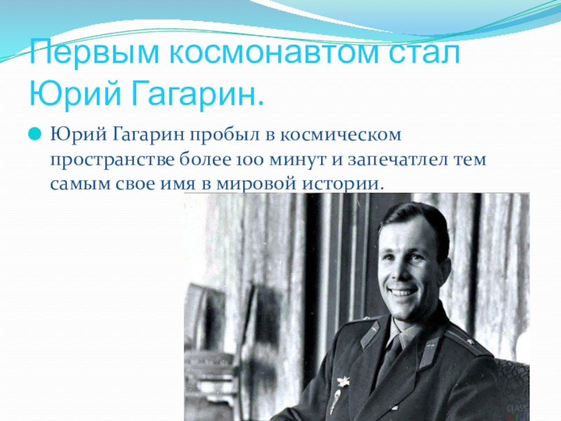 Слайд 3Первым космонавтом стал Юрий Гагарин.