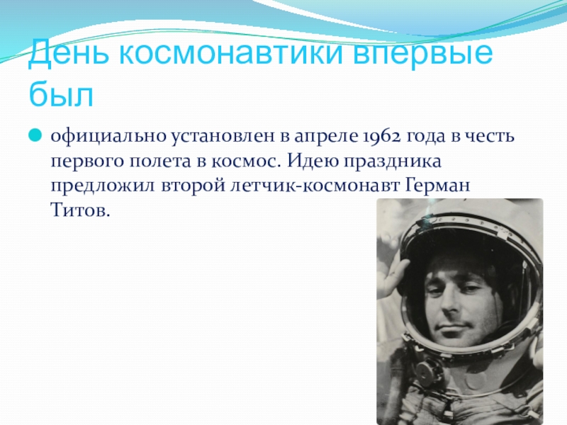 честь первого полета в космос. Идею праздника предложил второй летчик-космонавт Герман Титов.
