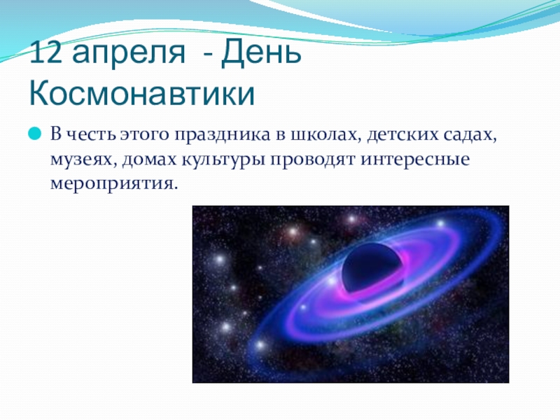12 апреля - День КосмонавтикиВ честь этого праздника в школах, детских садах, музеях, домах культуры проводят интересные