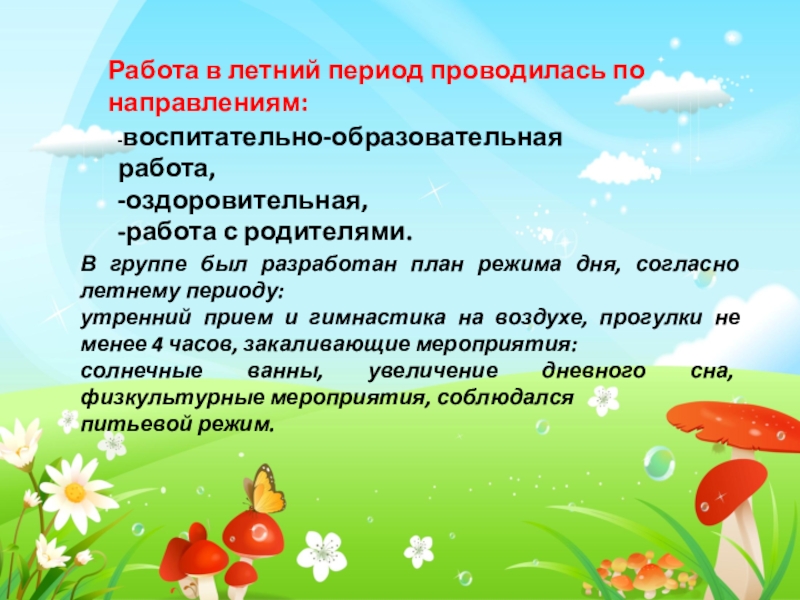 3. Осуществить педагогическое и санитарное просвещение родителей по вопросам воспитания и оздоровления детей в летний период.