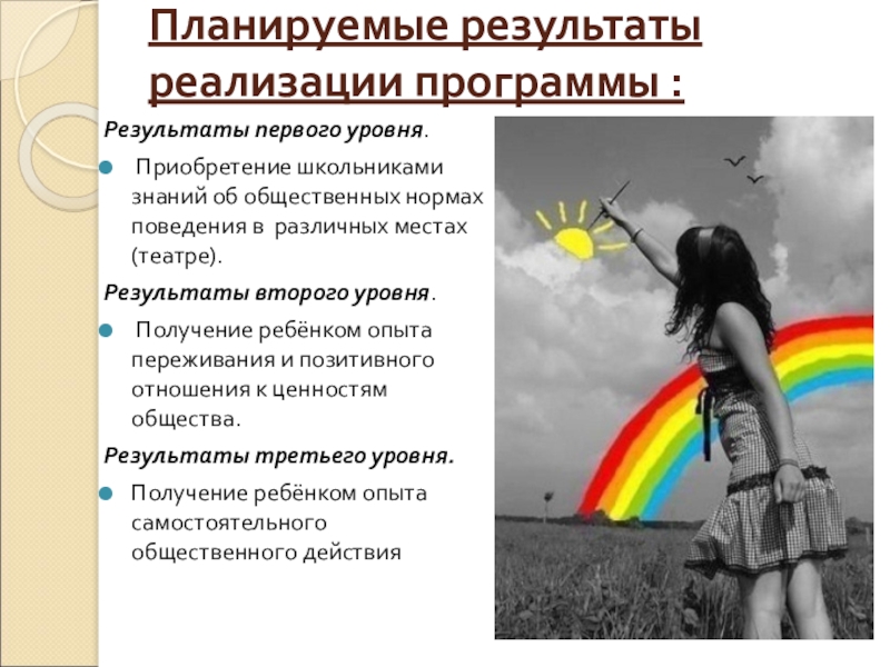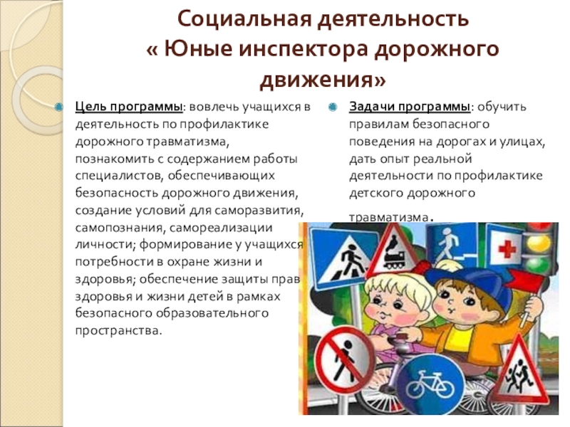 Задачи программы: обучить правилам безопасного поведения на дорогах и улицах, дать опыт реальной деятельности по профилактике детского дорожного травматизма.
