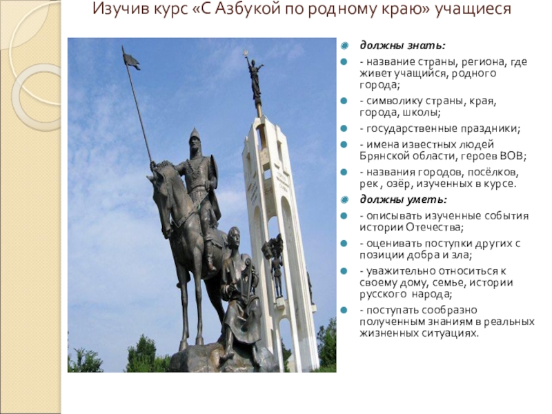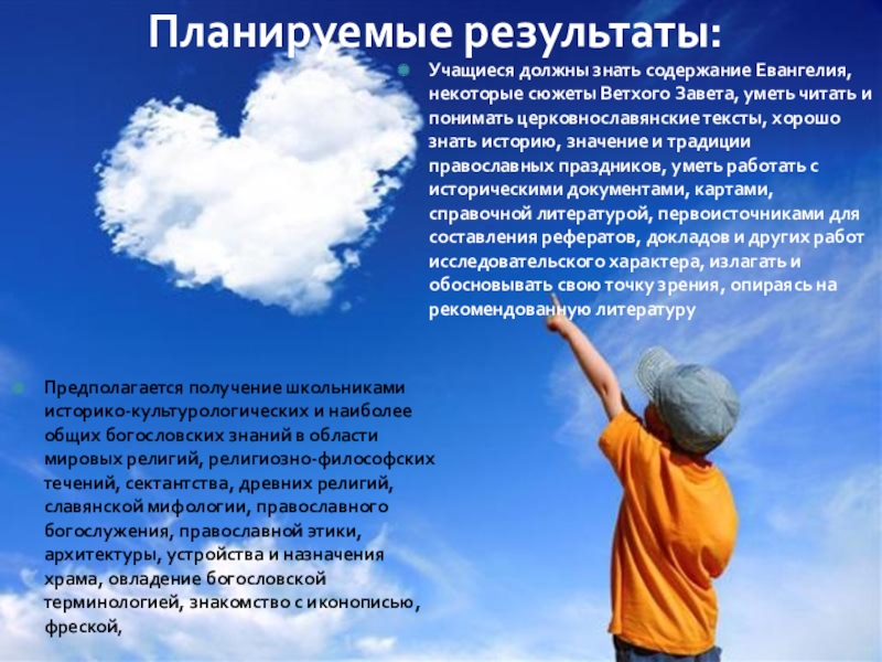 Учащиеся должны знать содержание Евангелия, некоторые сюжеты Ветхого Завета, уметь читать и понимать церковнославянские тексты, хорошо знать историю, значение и традиции православных праздников, уметь работать с историческими документами, картами, справочной литературой, первоисточниками для составления рефератов, докладов и других работ исследовательского характера, излагать и обосновывать свою точку зрения, опираясь на рекомендованную литературу