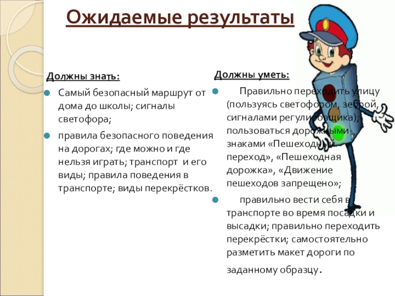 правильно вести себя в транспорте во время посадки и высадки; правильно переходить перекрёстки; самостоятельно разметить макет дороги по заданному образцу.