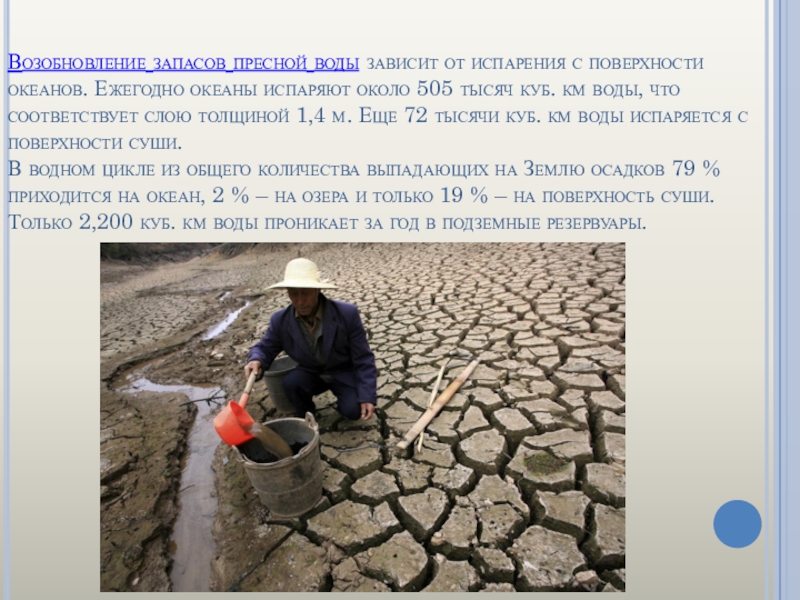 Слайд 7Возобновление запасов пресной воды зависит от испарения с поверхности океанов. Ежегодно